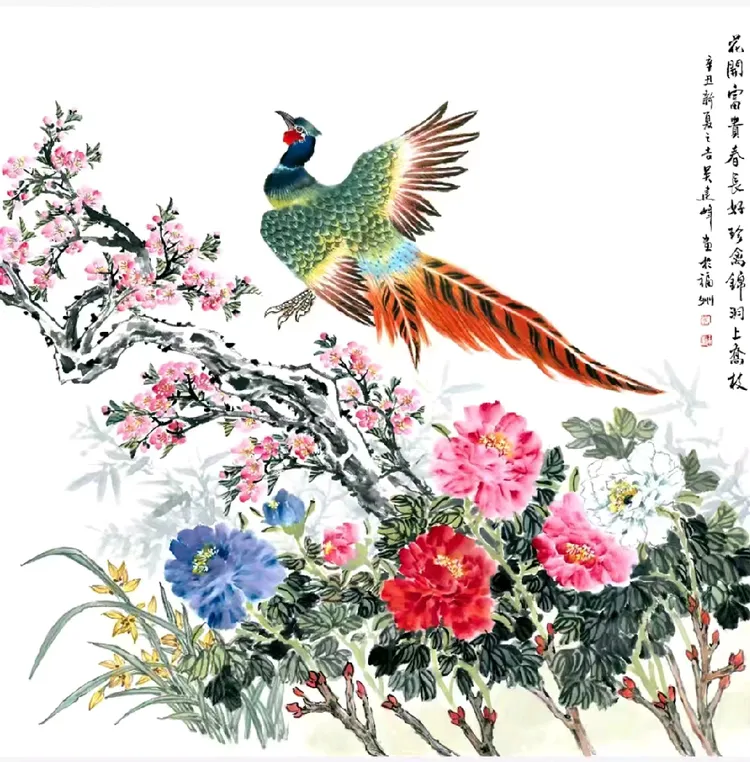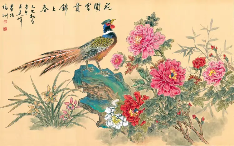 吴建峰老师的《花开富贵锦上春》,只觉工笔之妙尽在其间:牡丹叠瓣秾华,晕染得胭脂含露;锦鸡振羽而立,翎毛斑斓如缀星斗,连爪尖落石的力道都藏在笔锋里。兰竹衬于侧,春意裹着贵气,落笔是吉光,入眼皆温柔。
