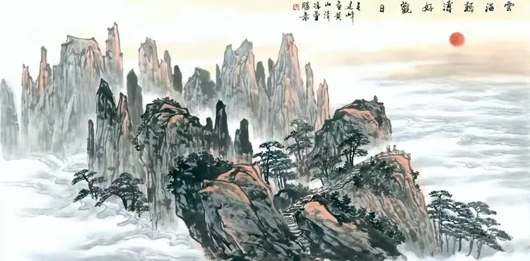 笔墨是懂春的:浓彩裹着清润,壮阔藏着柔媚,像把春日清晨的山河气息封进纸间,一眼望去,连呼吸都浸着霞暖与花芳。