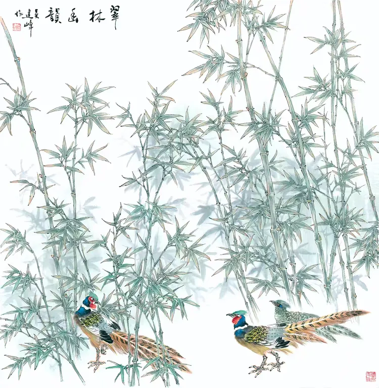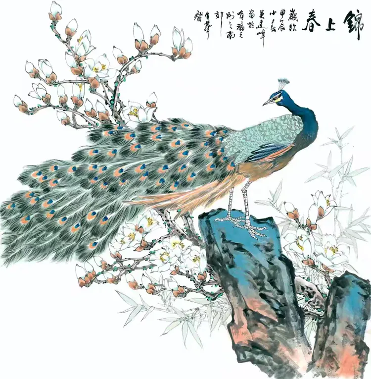 吴建峰老师的《锦上春》,便觉清贵之气扑面而来。孔雀是画中魂:青碧羽衣叠着金蓝圆斑,每片翎羽的纹理细如织锦,尾羽垂落时的柔润感,似有风从画间过;玉兰花是画中韵:白瓣裹嫩蕊,半开的花萼沾着浅棕晕染,连枝桠的苍劲都浸着春的润意。石畔细竹疏朗,笔墨揉合了工笔的精致与写意的舒展,连石纹都带着暖融的肌理——一笔一墨,都是把“清雅贵气”揉进了春的底色里。