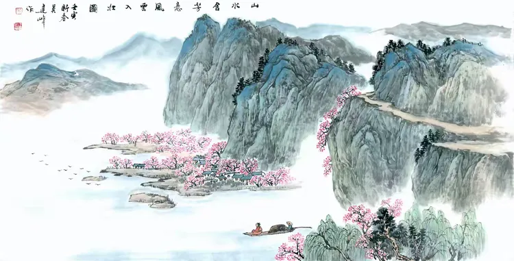 江波更见灵秀——薄雾缠在山脚,把山与水织成半透的纱,几叶扁舟浮在烟浪里,像被晨风吹斜的星子;岸边柳丝垂得软,桃花艳得俏,连屋舍的飞檐都沾着水汽,衬得整幅春山是“阔”的,也是“暖”的。