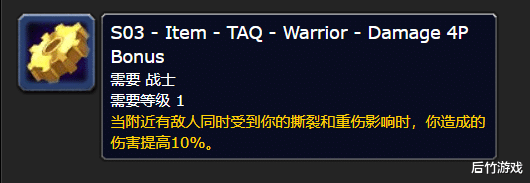 铭刻胸甲 - 血之狂暴:撕裂现在可以在狂暴姿态下使用,撕裂的伤害提高100%,每次造成伤害时额外造成相当于攻击强度4%(原3%)的伤害。