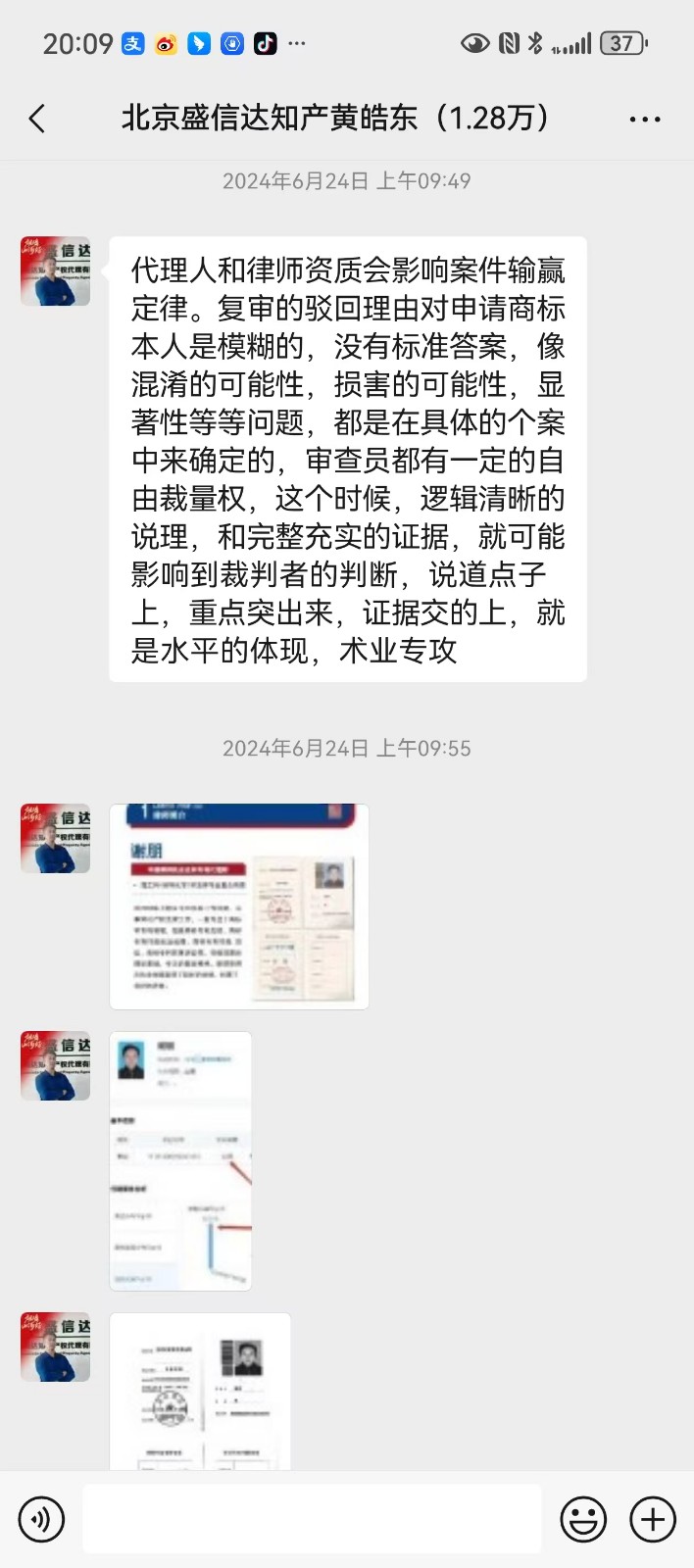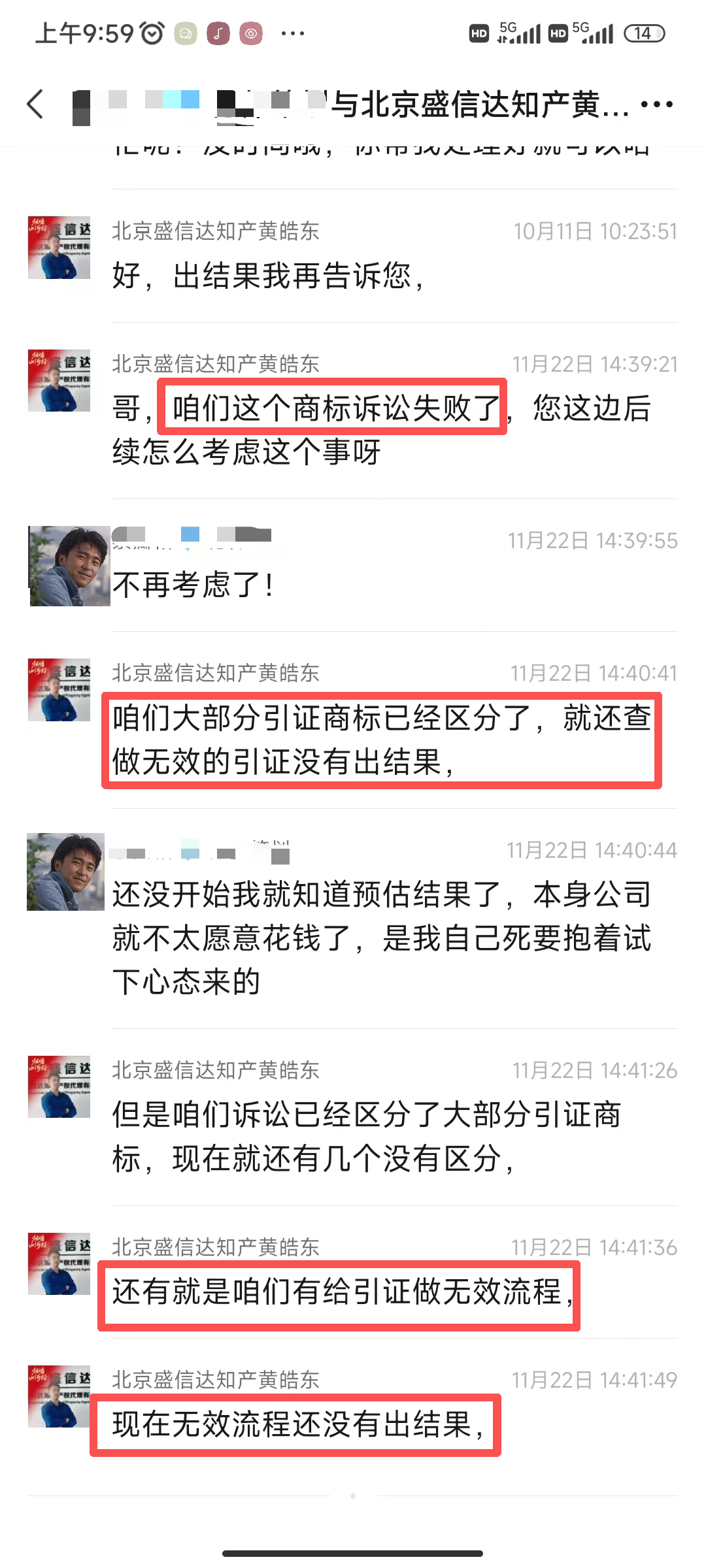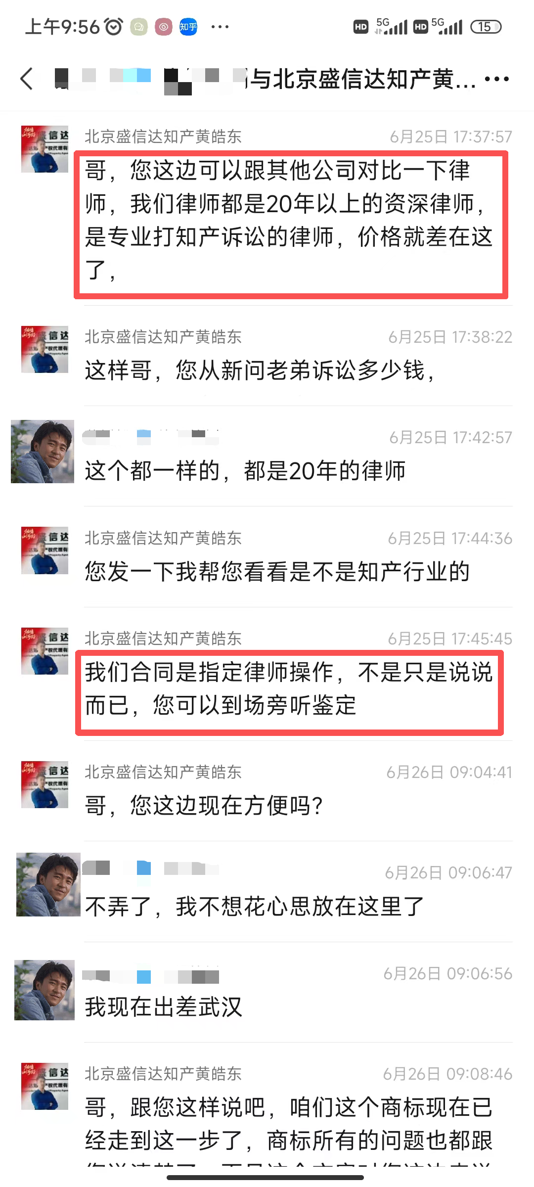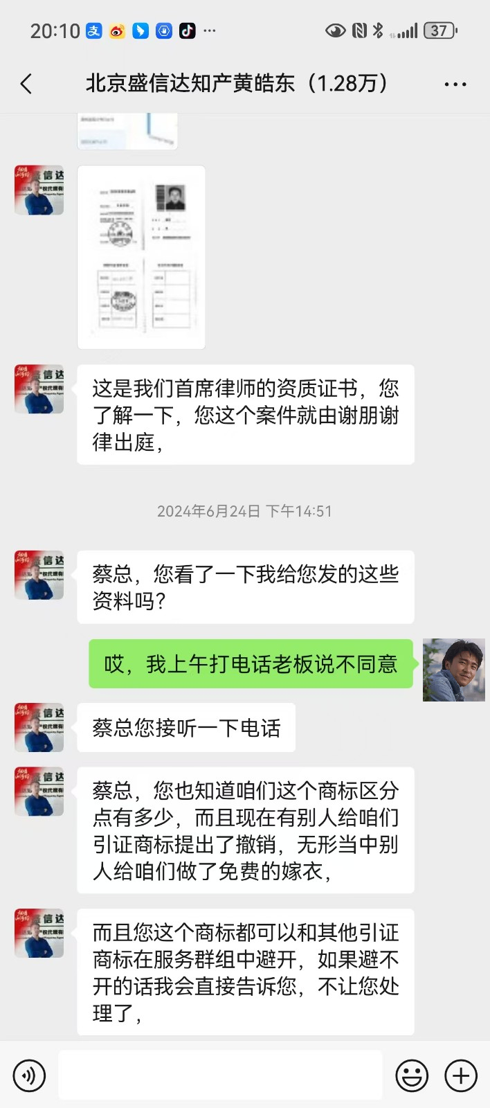 2024年6月27日,北京盛信达自称专业的知识产权工作人员联系到我,并让一位律师分析说,可以通过诉讼、同时向商标局提起引证商标无效申请的方式,帮我拿到商标使用权。