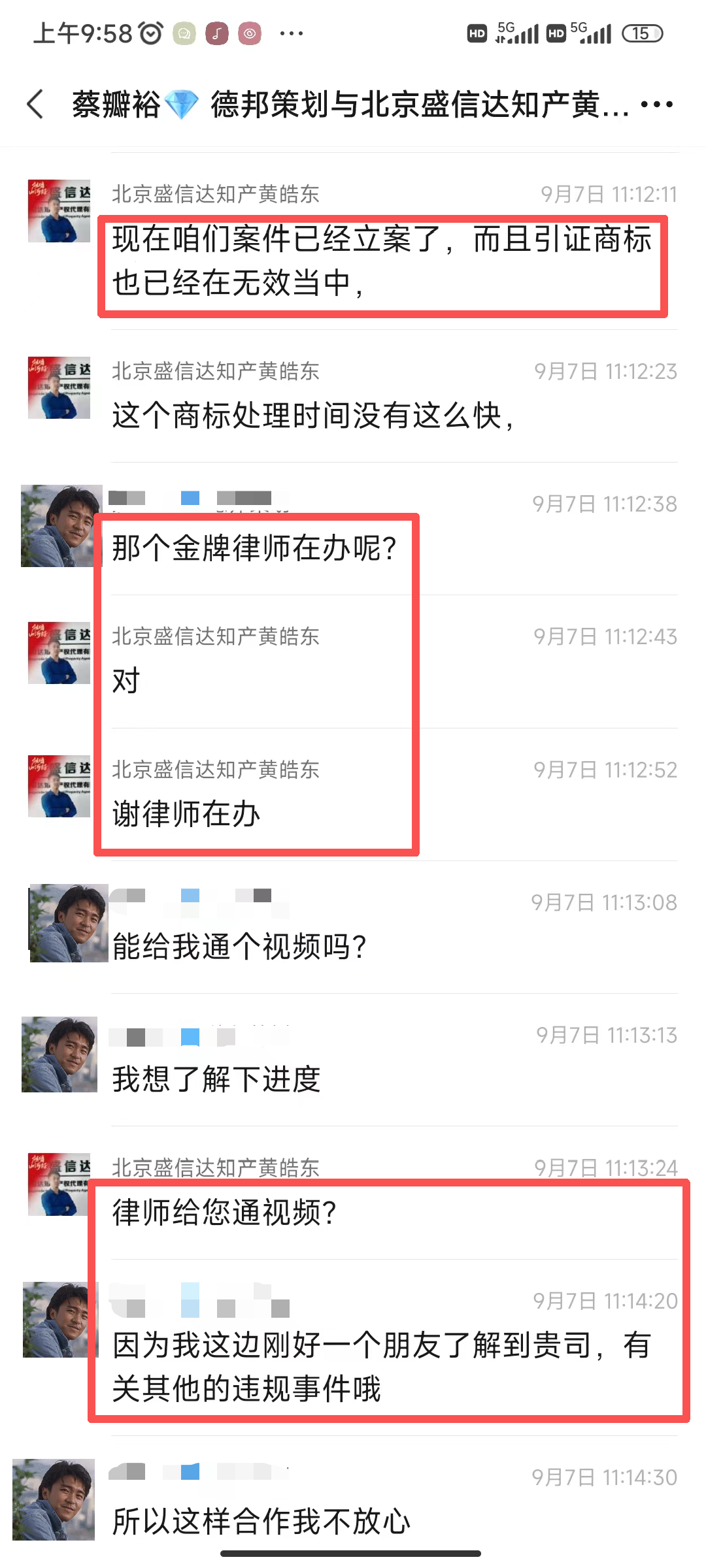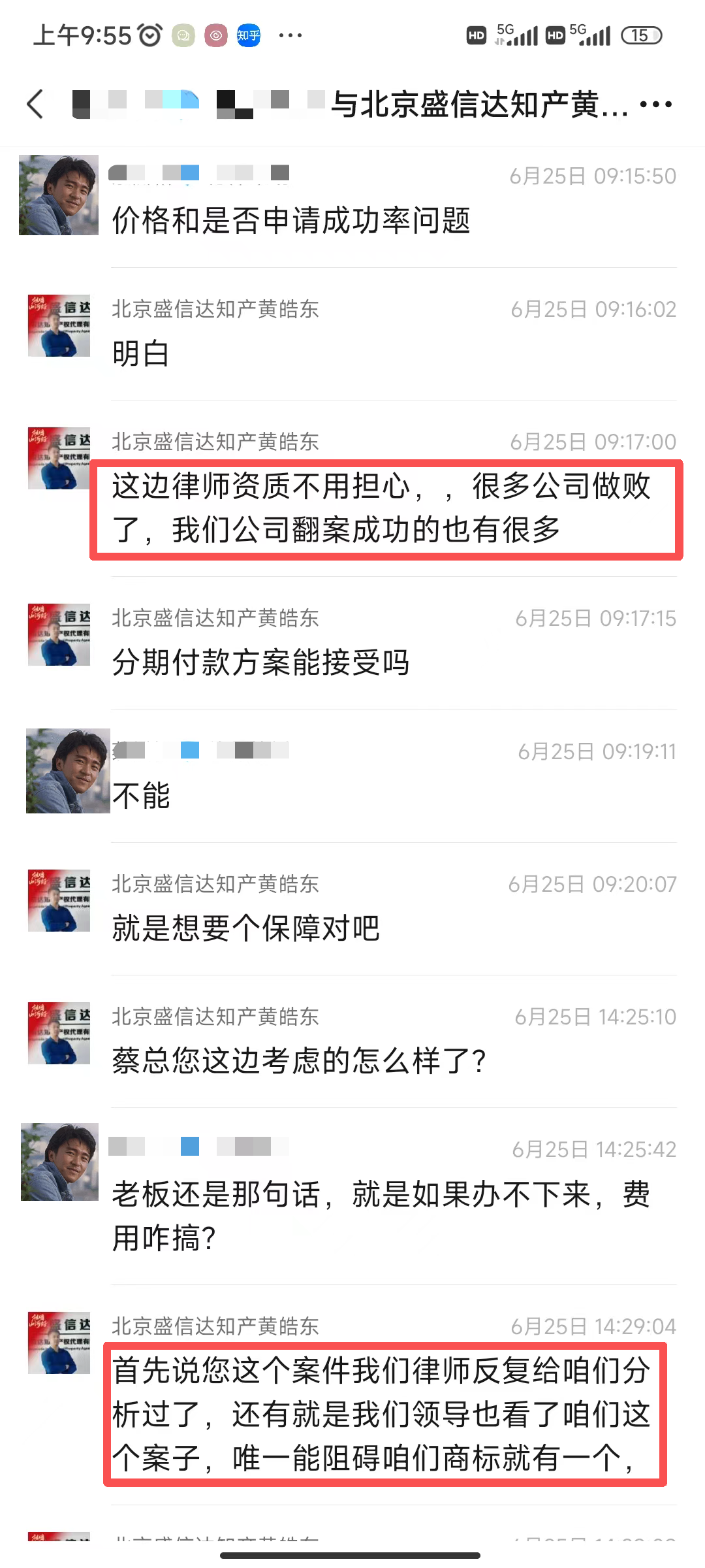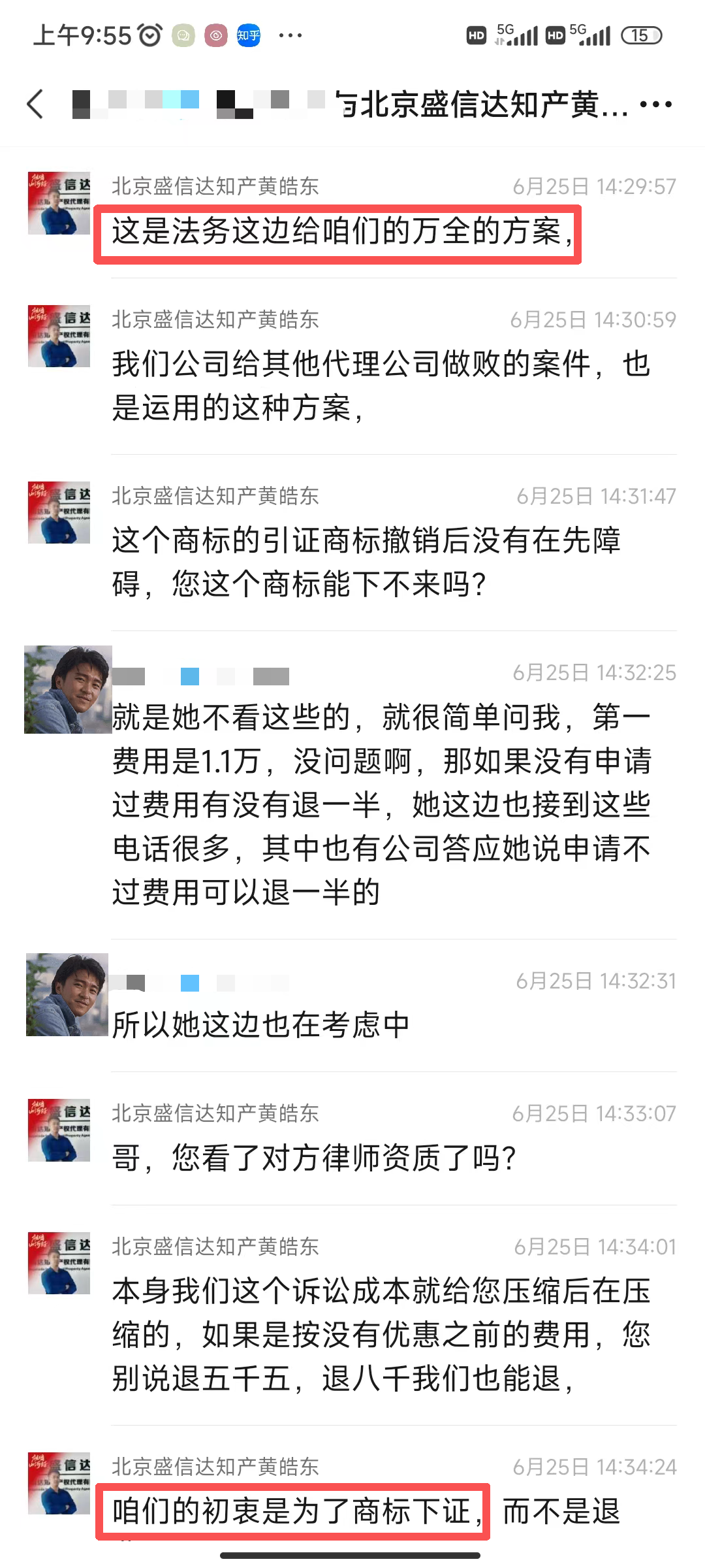 2024年6月27日,北京盛信达自称专业的知识产权工作人员联系到我,并让一位律师分析说,可以通过诉讼、同时向商标局提起引证商标无效申请的方式,帮我拿到商标使用权。