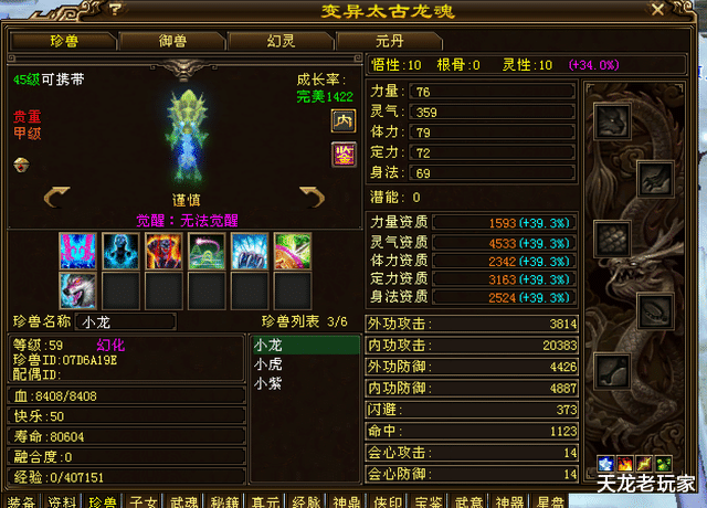 别看宝石还没上满,宝宝是一点也不含糊,比如有4533的双十太古龙魂——这在45级宝宝中,也是极为强悍的存在。