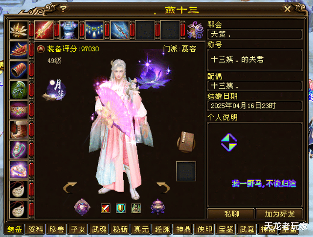 这个号还有一个亮点,就是全身手工装备都是自制大八星——当然了除了3个门派套、结婚钻戒和盟主腰带。