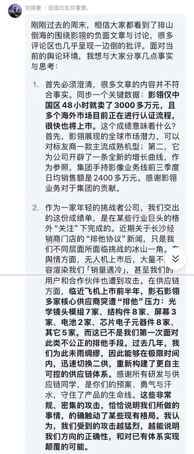 12月8日晚间,影石创新(688775.SH)创始人、董事长刘靖康在公司全员群发布公开信,对新款无人机面临的竞争与质疑等问题作出回应。