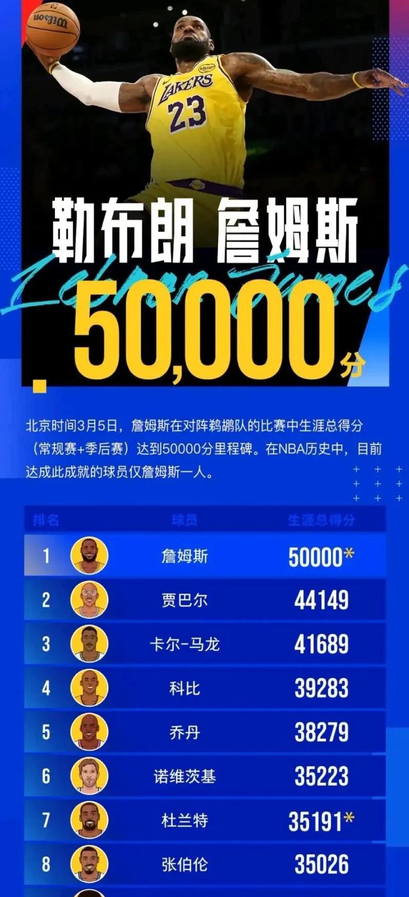 詹姆斯这老头子真是厉害啊,50000分就这么到手了,好像买菜一样简单。40岁了还能在NBA这么猛,真是让人不敢相信。这家伙是不是吃了啥返老还童的药啊