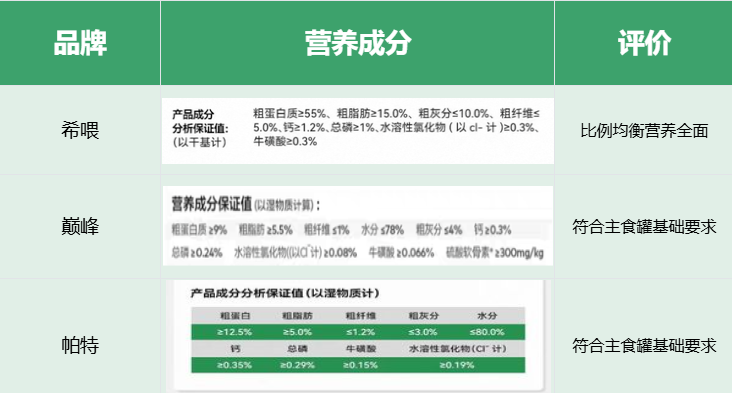 帕特:粗蛋白质≥12.5%,粗脂肪≥5.0%,牛磺酸≥0.15%,符合主食罐头基础要求。