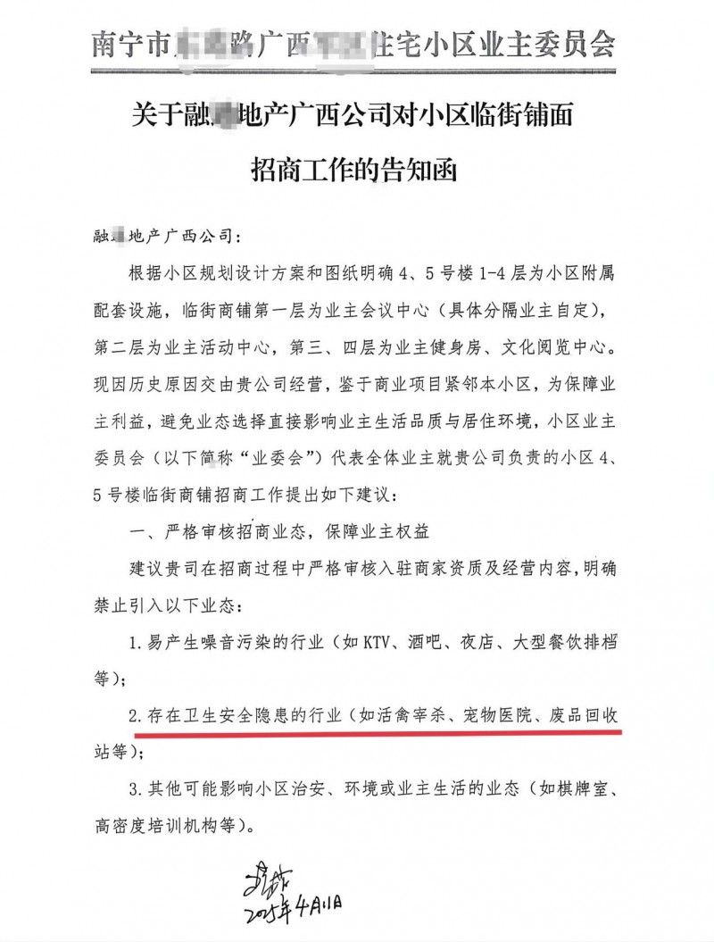 2025年4月11日,业委会向融某地产广西公司递交《关于融某地产广西公司对小区临街铺面招商工作的告知函》,依据小区规划设计方案及图纸说明,明确指出4、5号楼1-4层为小区附属配套设施,其中临街商铺首层规划为业主会议中心,二层为业主活动中心。函件中建议严格审核招商业态,并特别强调禁止引入“存在卫生安全隐患的行业(如活禽宰杀、宠物医院等)”,以保障业主生活环境安全。