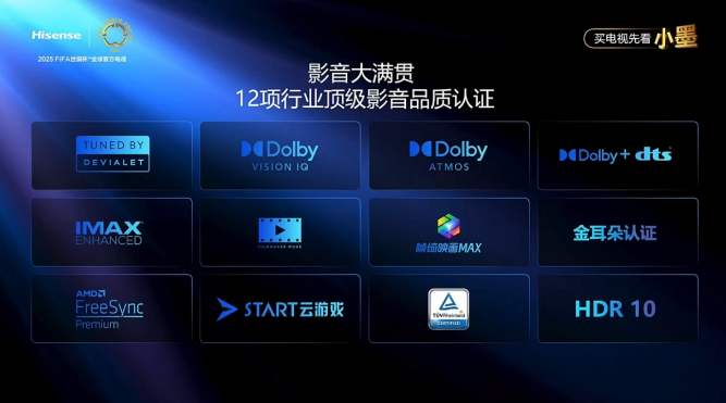 海信小墨E5Q Pro还拥有12项行业顶级影音品质认证,包括:Dolby Vision IQ、Dolby ATMOS、Dolby + dts、IMAX ENHANCED、帧绮映画 MAX、金耳朵认证、HDR 10等。