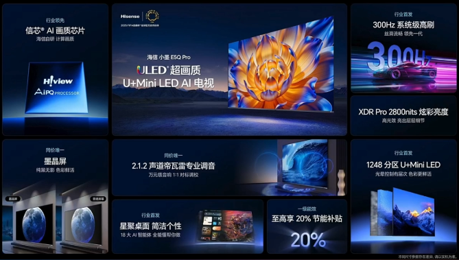 4月14日,在“小墨潮电节”上,海信电视2025超级大单品小墨E5Q Pro新品发布,海信小墨E5Q Pro首发千级分区U+Mini LED光晕控制系统,全系搭载海信自研信芯AI画质芯,支持光色精控、HDR 高动态、臻彩四维还原等功能,还支持16bits感控环境光、MEMC 运动增强等功能,以300赫兹系统级高刷新频率,重新定义电视的流畅体验。