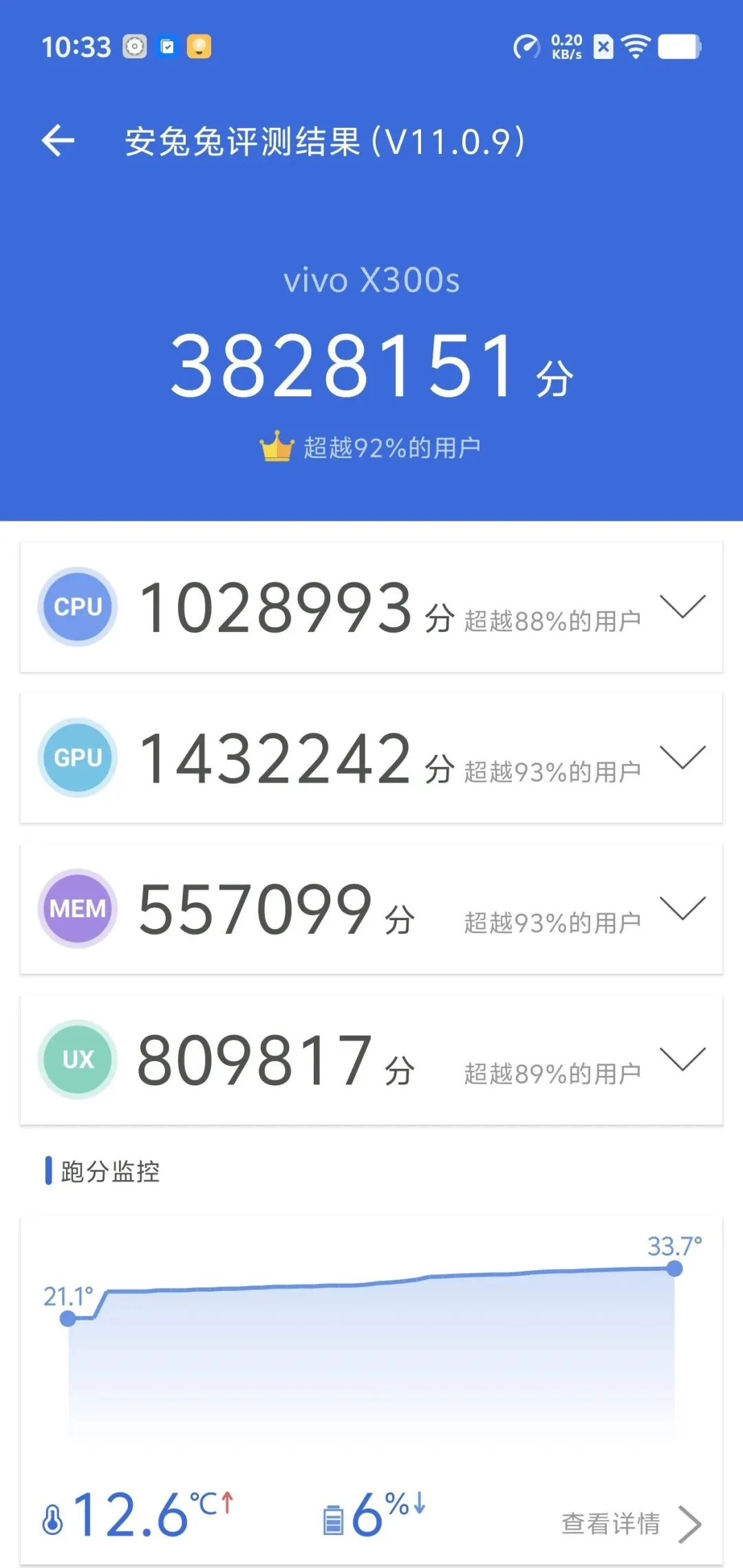 集齐以上技能,那么总要检验一下我们这一台vivo X300s(16GB+1TB)的真实水准。在安兔兔V11跑分中,vivo X300s斩获382万分,GeekBench 6和3D Mark中的得分同样亮眼。多项测试对于vivo X300s来说显得游刃有余,这组得分足以使得vivo X300s跻身性能机型的前列。