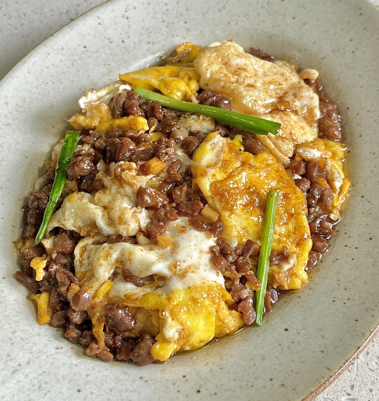 盛一碗热气腾腾的白米饭,舀一大勺肉末炒鸡蛋盖在上面,让金黄的蛋液和浓郁的肉末酱汁慢慢渗透进米粒里,每一口都裹着咸香的肉味和蛋香,简单却无比治愈。这道没有复杂技巧的家常菜,用最朴素的食材,传递着家的味道——它不需要精致的摆盘,不需要昂贵的食材,却能在平凡的日子里,给我们最踏实的温暖。就像生活本身,不必追求轰轰烈烈,一碗简单的拌饭,就足以让人感受到满满的幸福。