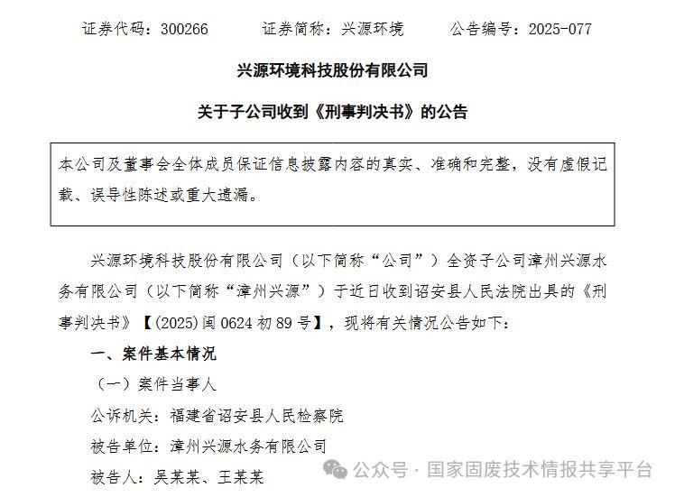 近日,兴源环境发布《关于子公司收到〈刑事判决书〉的公告》,披露其全资子公司漳州兴源水务有限公司(以下简称“漳州兴源”)因污染源监测数据造假被法院判处罚金,吴吴某某及王某某因“破坏计算机信息系统罪”受到刑事处罚。