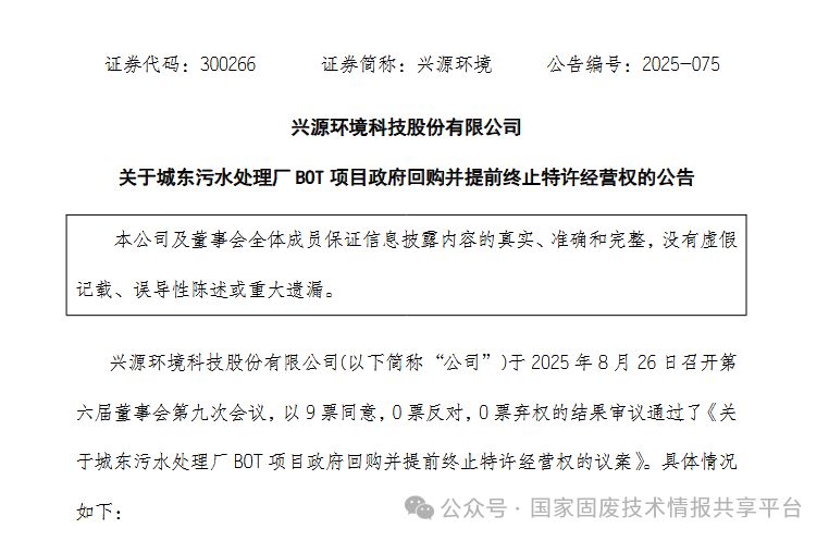 鉴于环保政策趋严及上游进水长期超标,导致项目运营的客观基础发生重大变化。兴源环境与诏安县四都镇人民政府、诏安工业园区管理委员会及漳州兴源于2025年8月26日签署《关于提前终止福建省诏安县城东污水处理厂特许经营权之回购协议》,同意提前终止特许经营权,并由诏安县四都镇人民政府按约定价格回购项目相关权益,回购价值约2895万元。