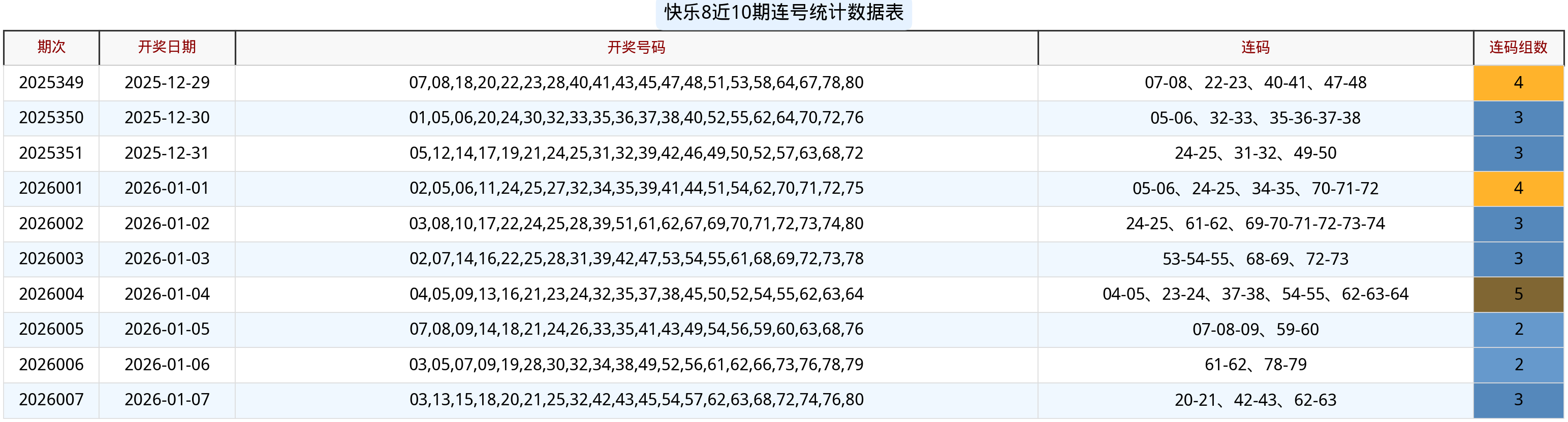 快乐8连号具有“集群性”特征,常以“多→少→多”循环出现;