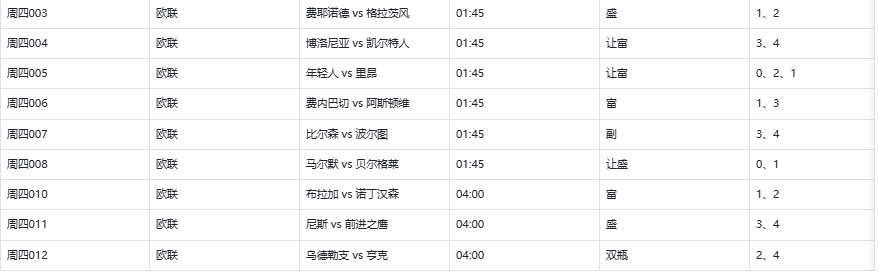 周四 003 欧联杯费耶诺德 vs 格拉茨风暴⏰ 时间:01:45📊 老朱随聊:费耶诺德主场一直挺有气势的,踢得比较放得开。不过他们在欧联防守不太稳,丢球不少。格拉茨风暴欧战客场表现一直没太大起色。这场我觉着主队机会更大一点。