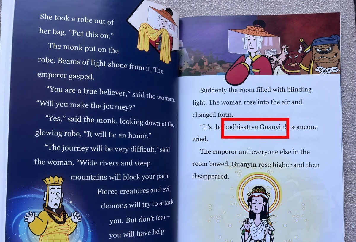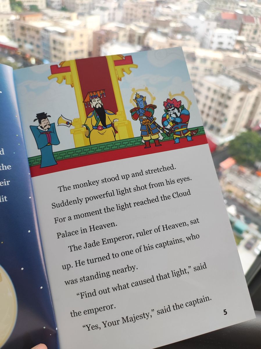 再比如Bodhisattva,刚开始孩子完全不理解这个单词是什么意思,但是故事中出现了很多次,每次孙悟空有难都要找Bodhisattva帮忙,观音菩萨bodhisattva Guanyin、文殊菩萨bodhisattva Manjusri、灵吉菩萨bodhisattva Lingji......一回生,二回熟,孩子们很快就能理解这就是中文里熟悉的菩萨的称呼。