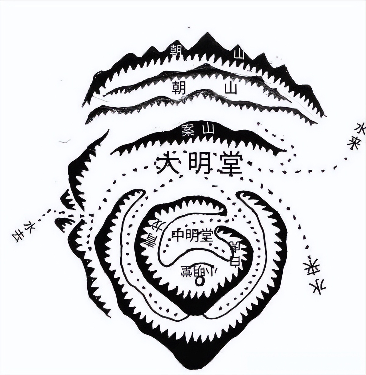 凡山势来得缓慢,平平结穴,龙虎环抱案台近,则论中明堂,中明堂最好是地面平坦窝钳,形状整齐不要太阔,又不可太狭。若有水要清、澄、深,如铜锣、如锅底,这是上吉明堂。风山势来得急,垂下结穴,前案远则论大明堂。外明堂,必须两边宽度不可狭窄,四面山要围绕、封锁,无空缺,明堂如片纸,明堂通走马,为上吉明堂。