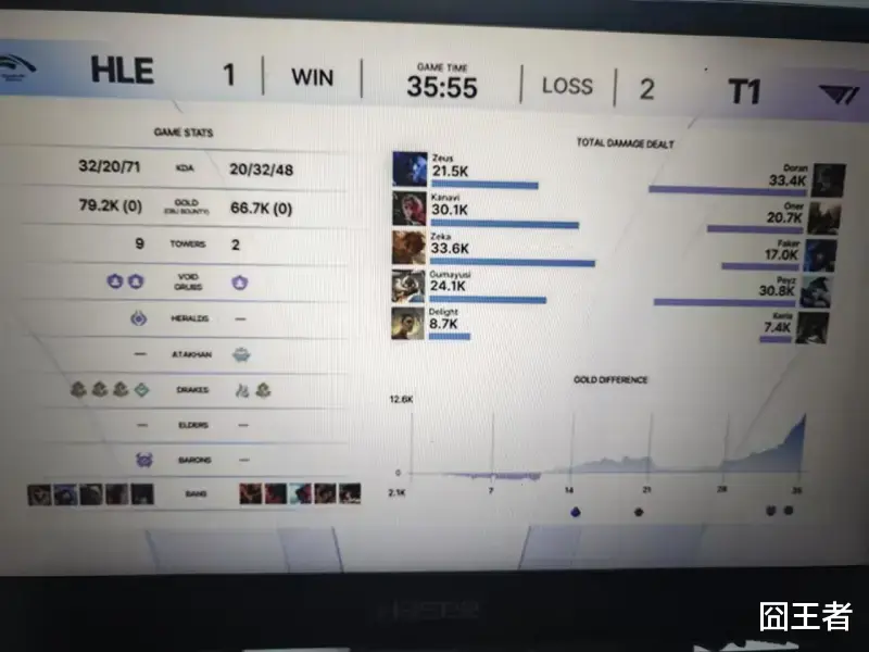 结果第一局比赛的前期,Keria牛头线杀帮助T1打出优势,HLE一度咬住局面,伺候双方一直纠缠。直到比赛第25分钟左右,Zeus安蓓萨率先阵亡,T1打出1换4大胜拿下大龙;最终比赛第27分55秒,T1再度打出1换4后一波结束比赛。