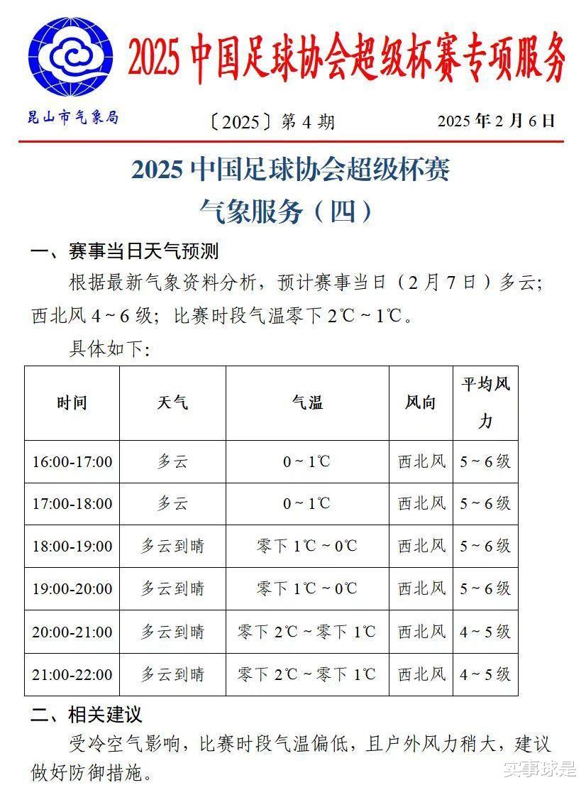 2月6日,昆山市气象局专门为超级杯发布的权威气象服务信息显示,预赛比赛当天昆山为多云天气,西北风4~6级,比赛时段的气温为零下2℃~零下1℃;而当天的最高气温仅为1℃。值得一提的是,由于比赛时段风力也较大,所以,实际的体感温度,还会低5℃左右。
