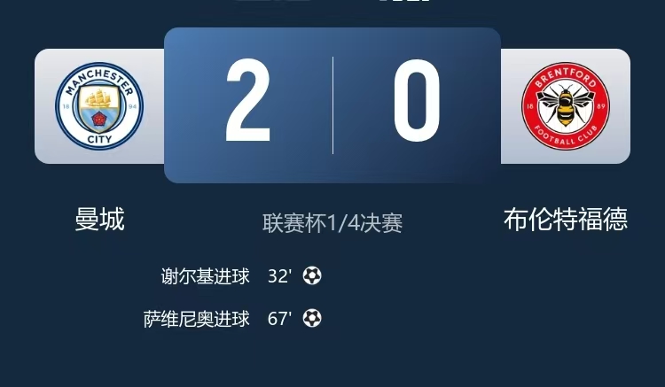 12月18日讯 联赛杯1/4决赛,曼城坐镇主场伊蒂哈德球场迎战布伦特福德。上半场,鲍勃伤退,谢尔基远射首开纪录。易边再战,萨维尼奥进球。最终曼城2-0布伦特福德晋级四强。
