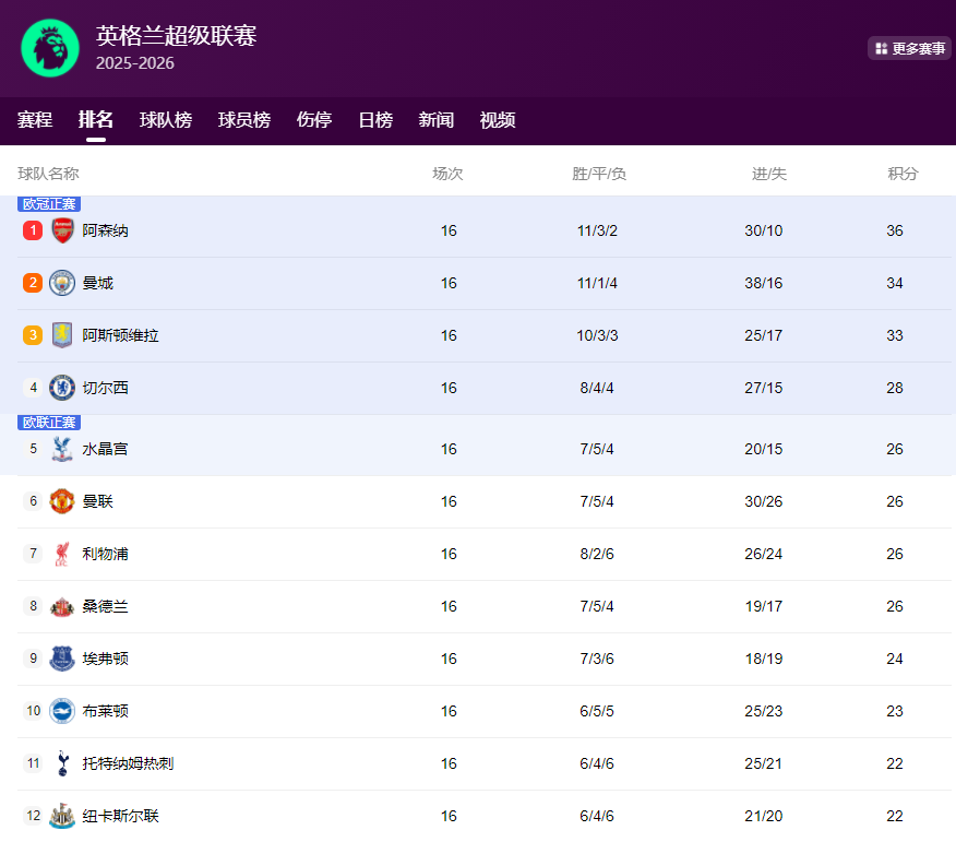 英超积分榜