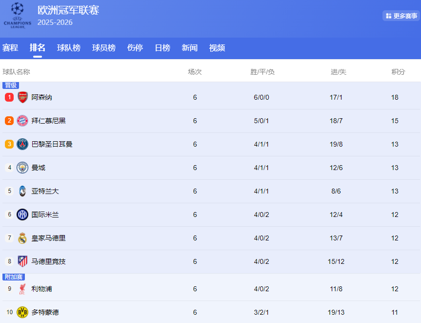 欧冠积分榜