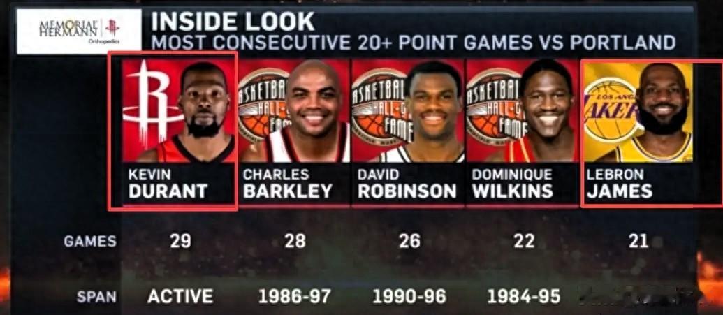 勒布朗·詹姆斯职业生涯最长的连续25+得分纪录仅为21场,而科比·布莱恩特的生涯连续25+纪录是19场,两者均远低于杜兰特对开拓者的这一特殊纪录。