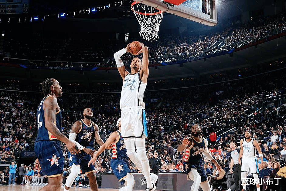 再看防守端,文班亚马更是展现出了历史级别的天赋,算得上是联盟最具威慑力的防守核心,甚至可以说没有之一。他的护框范围能覆盖整个禁区到三分线,盖帽时机的判断、协防补位的意识、干扰投篮的能力,都远超同年龄段的球员,甚至比很多老将都出色。