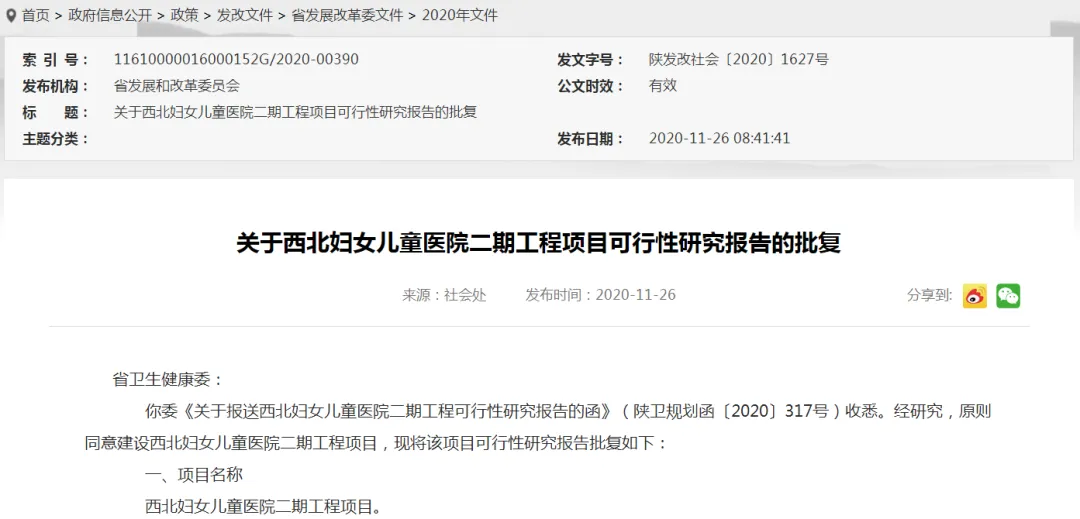 2020年11月陕西省发改委发布了《关于西北妇女儿童医院二期工程项目可行性研究报告的批复》,该项目获批。
