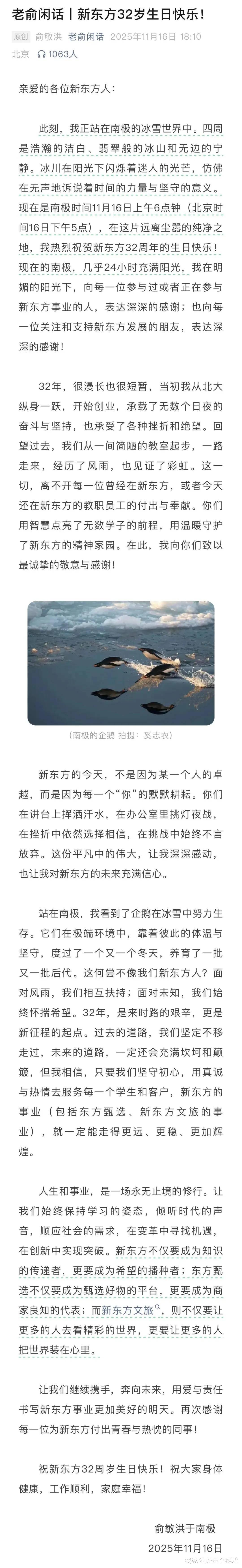 11月16日,新东方迎来成立32周年纪念日,创始人俞敏洪发布了一封内部信,向全体员工及支持者表示感谢。