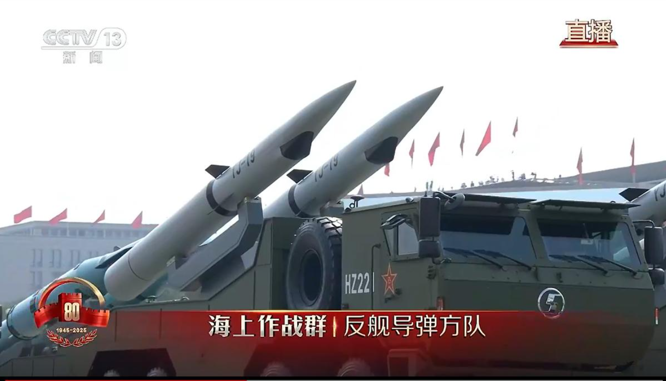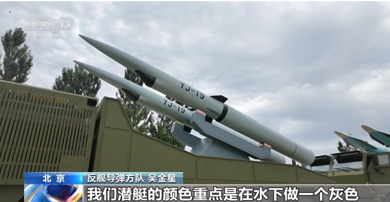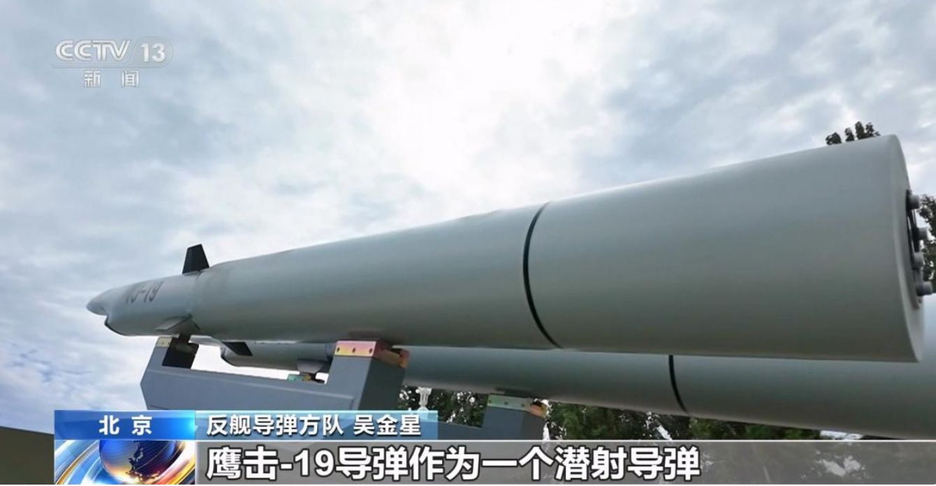 在央视实况转播视频中,对于鹰击19反舰导弹的介绍,打出的字幕是“潜射导弹”,解说词中有吸气式高超音速,533毫米鱼雷管发射、射程远、突防强、毁伤大等关键内容。