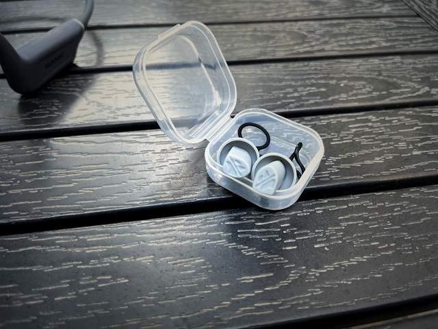 其次,是游泳耳塞,和2根硅胶麦克风保护塞,都收纳在一个防水塑料盒中。
