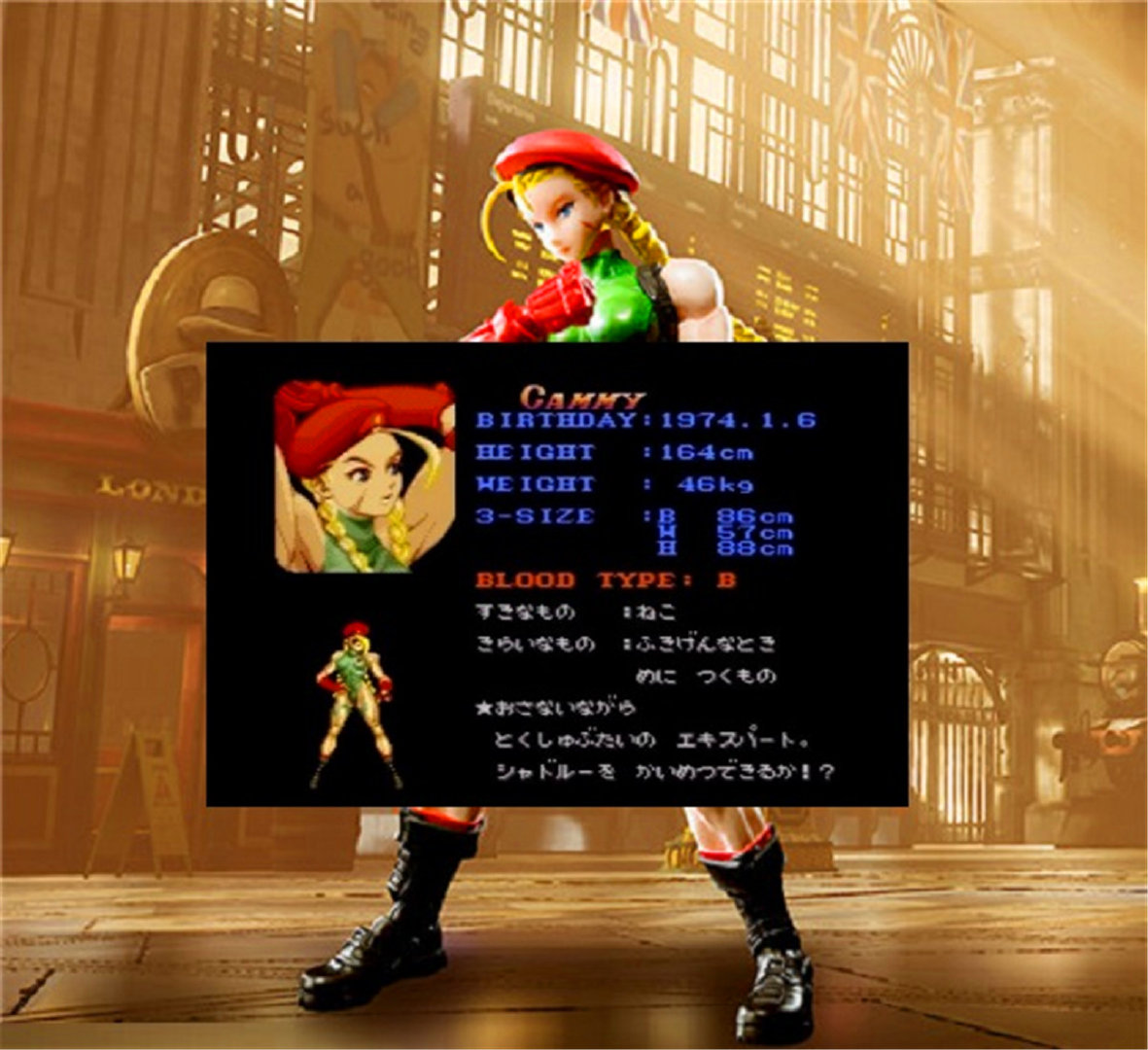 这里博士解释一下:《街头霸王》系列里,角色们的造型都在不断迭代变化中,而在六代中,嘉米·怀特的样子就和以前完全不一样了。之前的经典造型、大家熟悉则是那一身“红三角”特务高叉紧身衣。除了衣着之外,我还发现了一个差别,那就是:以前的身材似乎更加凸显了肌肉的呈现,如今的嘉米·怀特则更加“柔美”。