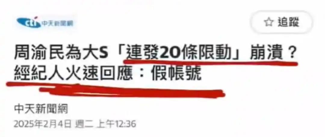 在大S离世的消息传出后,网络上曾一度盛传周渝民在社交平台上连发20条动态悼念她。
