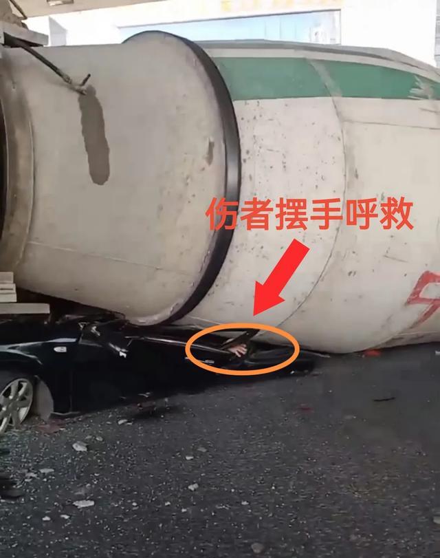 视频显示,被压扁的私家车里伸出一只手来向外面摆手呼救,证明车里的人还活着。事故发生后,现场有人报警。