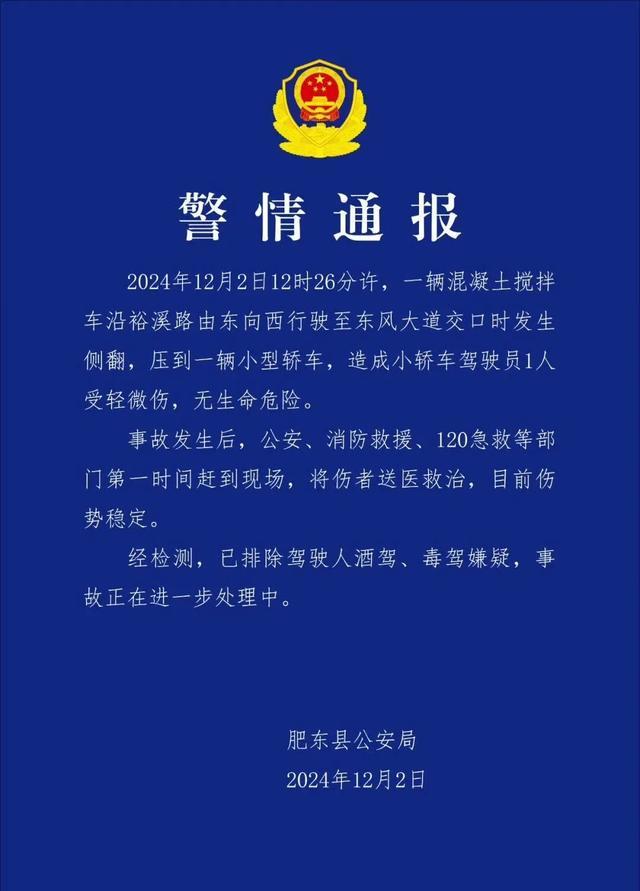 11月2日下午,合肥警方迅速通报了这起交通事故,证实了网传事件的真实性,也确认了该事故并没有造成人员死亡。