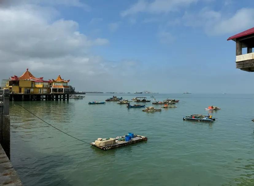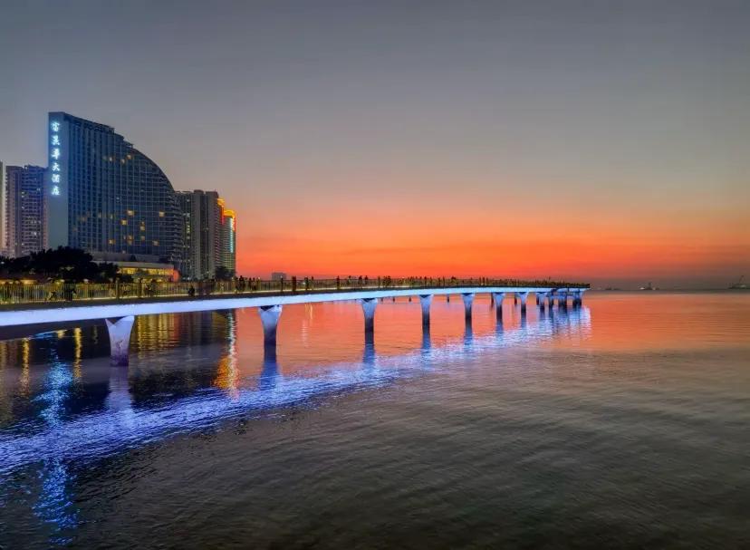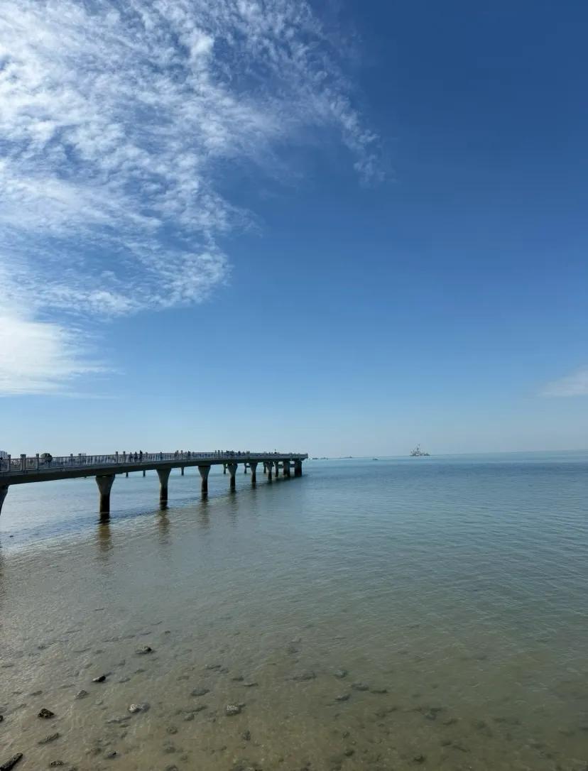 2.从金滩去海上观景栈桥沿岸边直行即可,无需购票;金滩中心位置到栈桥约1.3公里,步行20分钟左右不算远。整座栈桥长约1公里,步行走完仅需20多分钟,且栈桥头还有广场可休息,周边还有小卖部。