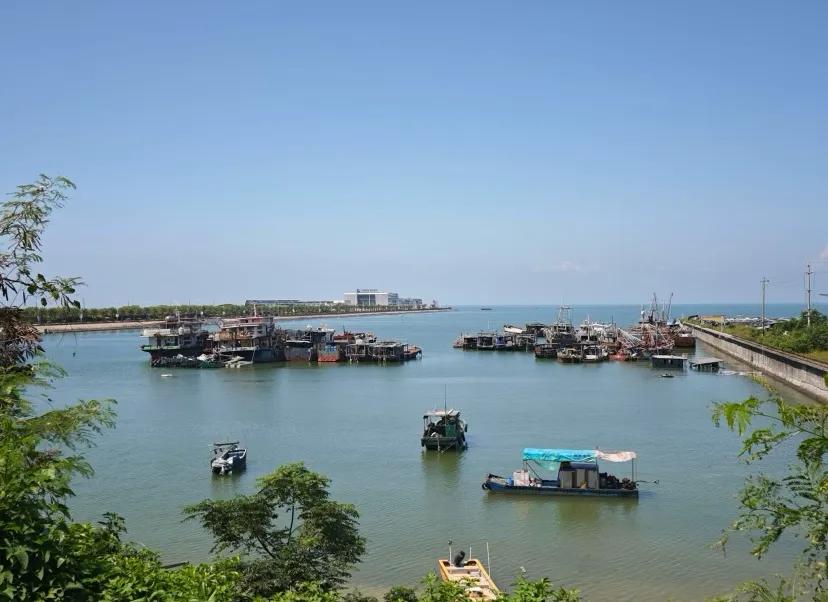 侨港海滩离侨港风情街很近,约1公里,可以坐观光车过去,也可以走路,侨港海滩和银滩实际都是一个整体。只因为中间隔着一个渔港,而被一分为二,这里的风浪比银滩大,但风光旖旎,景色怡人,蓝天与海水一色,白云沙滩同映,人在景中走,船在远处停,游人与摊贩的互动,景色与人流的和谐,安静祥和的海风吹拂,让人流连忘返。