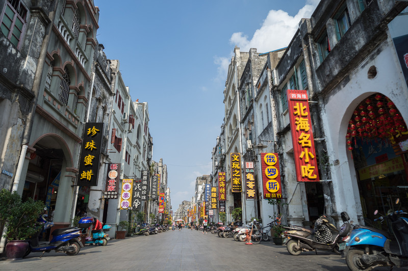 北海老街北海老街位于市区西北部,在北部湾畔临海而起,入选首批“中国历史老街” 。老街由三条百年老街珠海路、沙脊街、中山路组成。最初是始建于1821年只有200米长的升平街,后来北海作为通商口岸后,不断扩建成为商业中心,1.44公里长的老街两旁,分布着英法德等国领事馆旧址、德国森宝洋行旧址和天北海关大楼等许多中西合璧的骑楼式建筑。如今修复改造后的北海老街,成为一条特色的商业街,成为北海打卡的旅游地标。