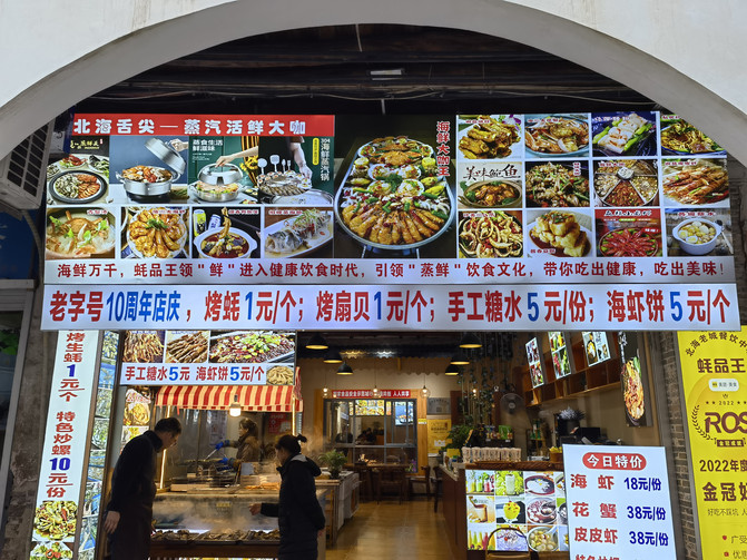 3.老街上很多餐饮店铺,大多以海鲜、虾饼、米粉、菠萝包、广式糖水、越南咖啡和法棍三明治为主。也有很多海鲜干货店,可以买到虾干、鱼干、海米、干贝之类的。老街毕竟是旅游地点,餐饮物价相对较贵,建议吃点特色美食尝尝鲜,不要在此吃海鲜大餐。