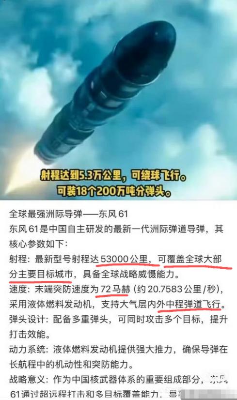 我真是服了,有些人真是敢编、会编,自从国产新型公路机动洲际导弹东风-61亮相后,关于该导弹的性能猜测就不绝于耳,而且越传越离谱。有人敢瞎编,就有人敢瞎信,让人啼笑皆非。关于东风-61的射程,有的说是4.2万公里,有的说是5.3万公里;关于速度,有的说55马赫,有的说72马赫。真是张嘴就来啊。