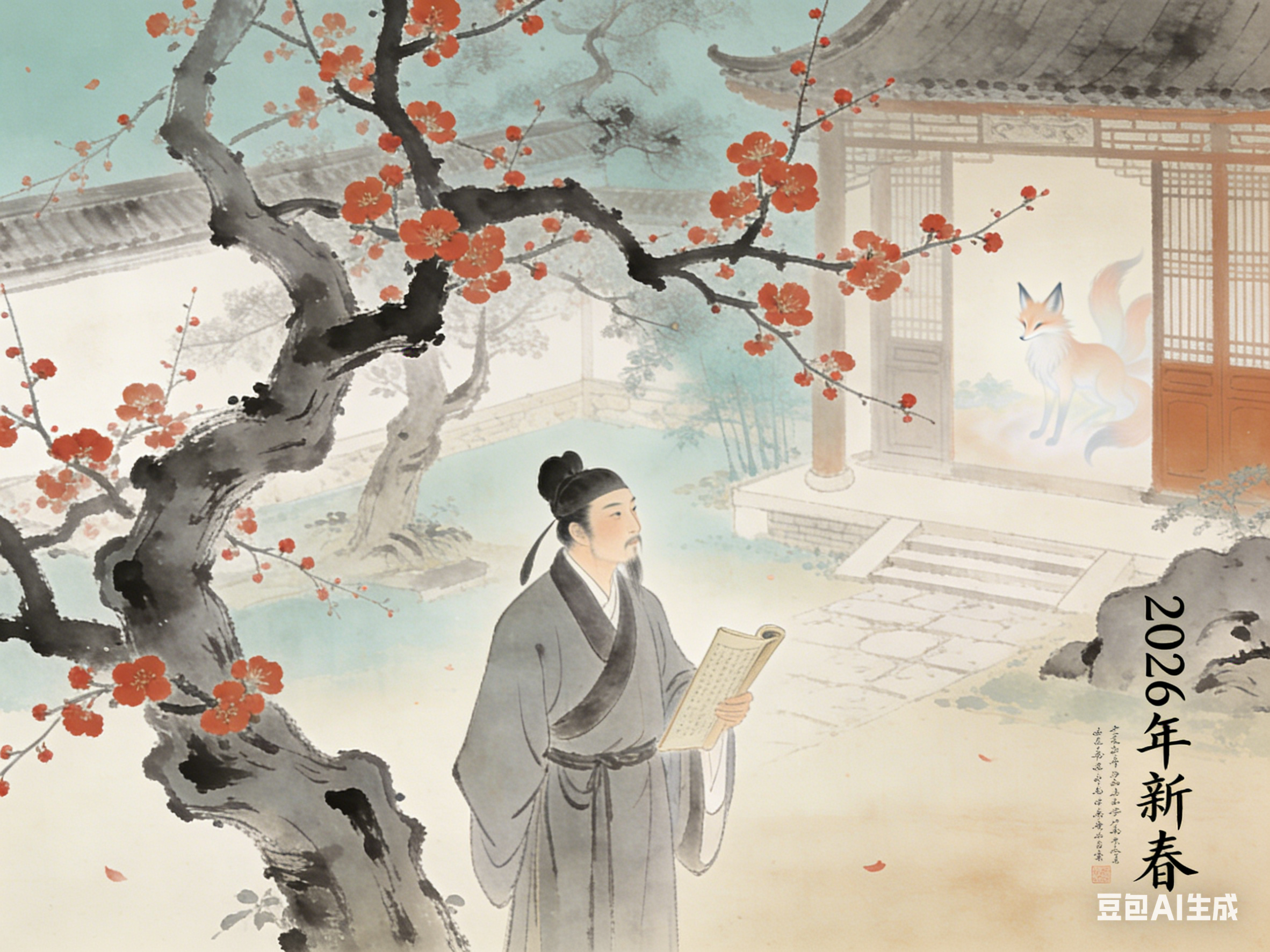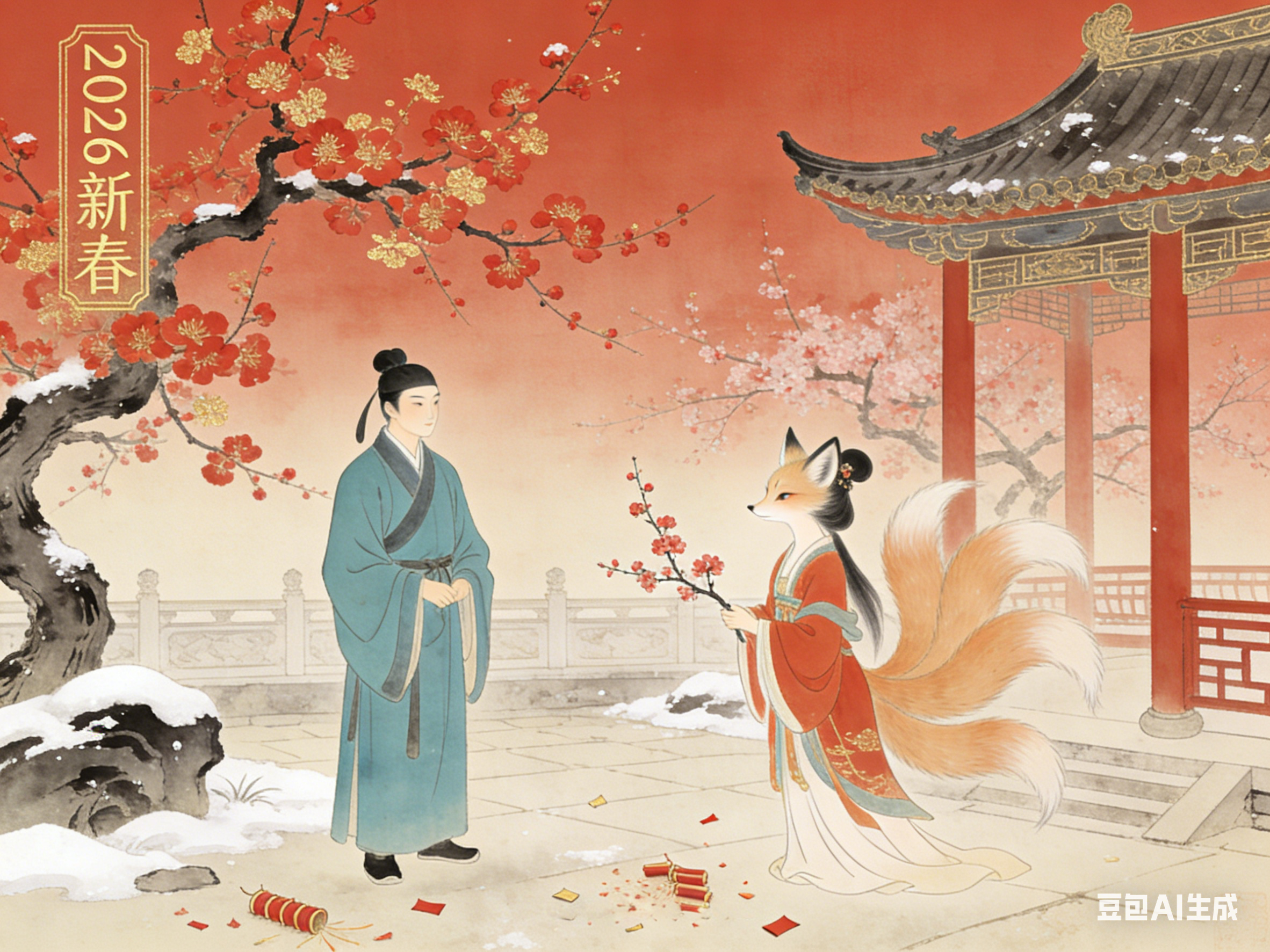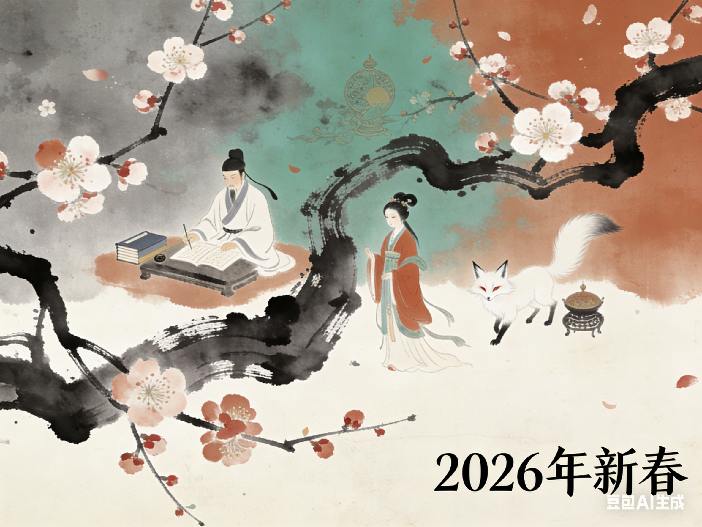 狐影承载情义与坚守,是精神内核;梅香传递雅韵与吉祥,是文化点缀;马岁彰显进取与生机,是时代底色。三者相融,狐影伴梅香,梅香映马岁,马岁润狐影,形成“聊斋狐影伴梅香,马岁春声入古卷”的雅致意境,也构成了中式新年的文化内涵。