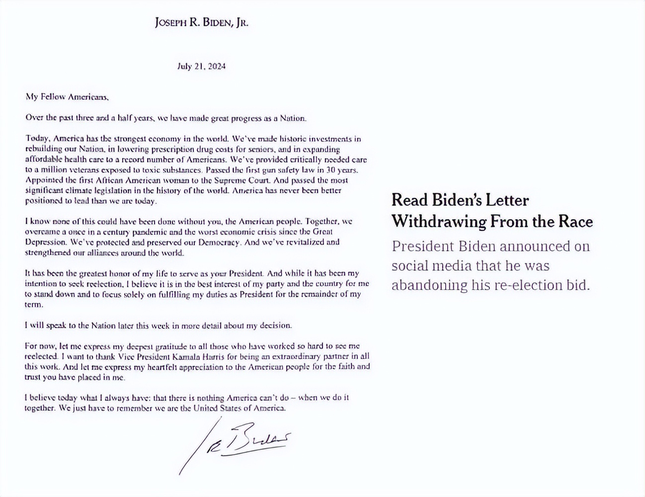 只有2024年12月1日,那份给予其子亨特的赦免令,以及2024年7月21日的退选声明,这两份文件的签名笔触显得尤为生动,带着不均匀的墨水沉淀和无法掩饰的书写抖动。