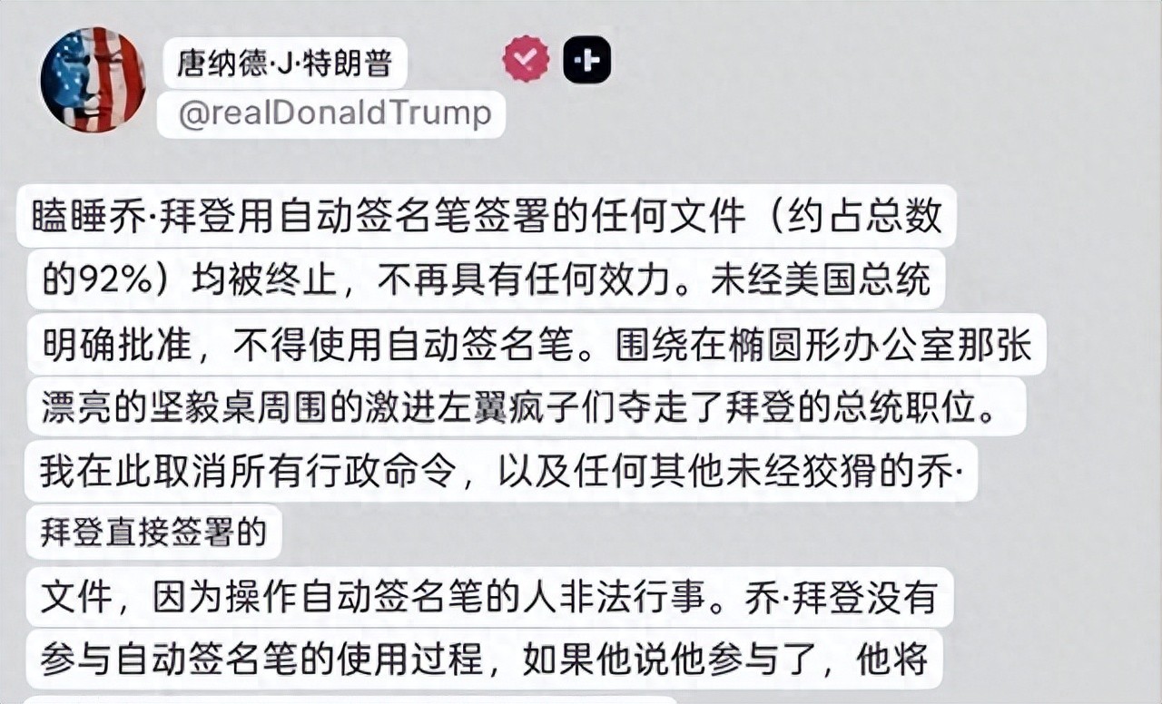 特朗普阵营自然嗅到了这里面巨大的政治血腥味,在2025年3月17日,特朗普在社交媒体上发布了一张极具讽刺意味的图片:将白宫总统肖像的位置换成了一支机械自动笔的照片,并配文嘲讽“真正控制那支笔的人才是真正的总统”。