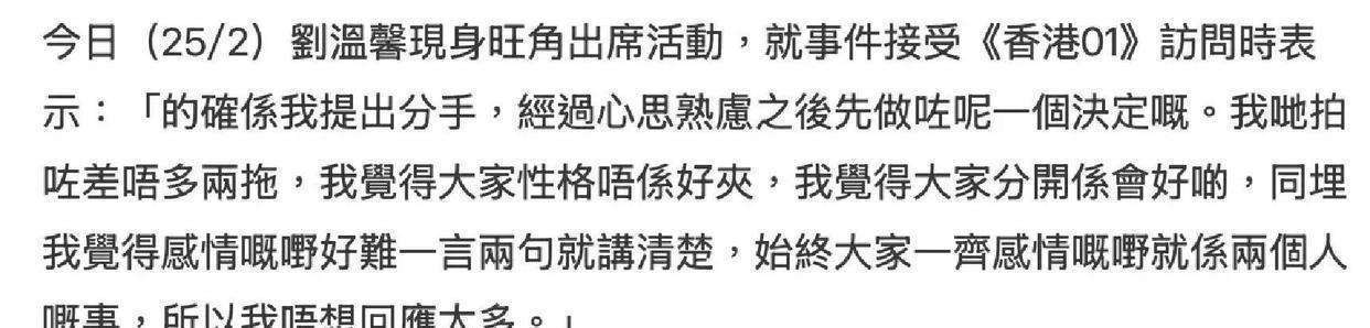 庞景峰和港姐刘温馨的两年恋情,在情人节后突然划上了句号。刘温馨毫不避讳地在公开活动中坦言,是她主动提出了分手,且这一决定早已在她心里酝酿已久。原因其实很简单,性格不合,继续下去恐怕对彼此都没有好处。她郑重声明,分手并没有第三者介入,也没有任何不忠的事情发生,只是祝福彼此,但两人今后将不再有任何联系。虽然庞景峰没有在媒体面前直接发声,但之前他曾提到专一一词,让外界不禁猜测其中是否另有隐情。而刘温馨仅用一句无关便切断了所有猜测的空间。