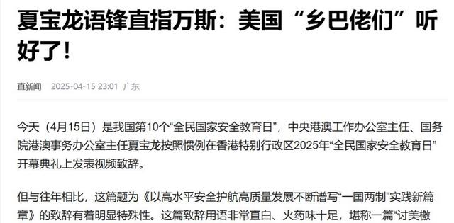 中央港澳办主任夏宝龙:让美国那些“乡巴佬们”在中华民族五千年文明面前去哀鸣吧——观察者网2025-04-15