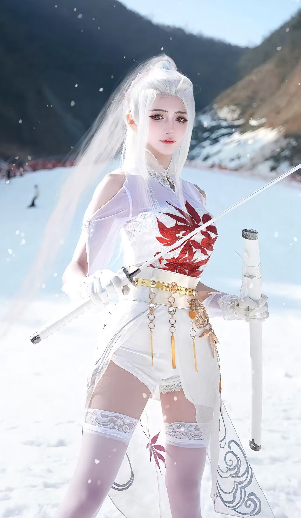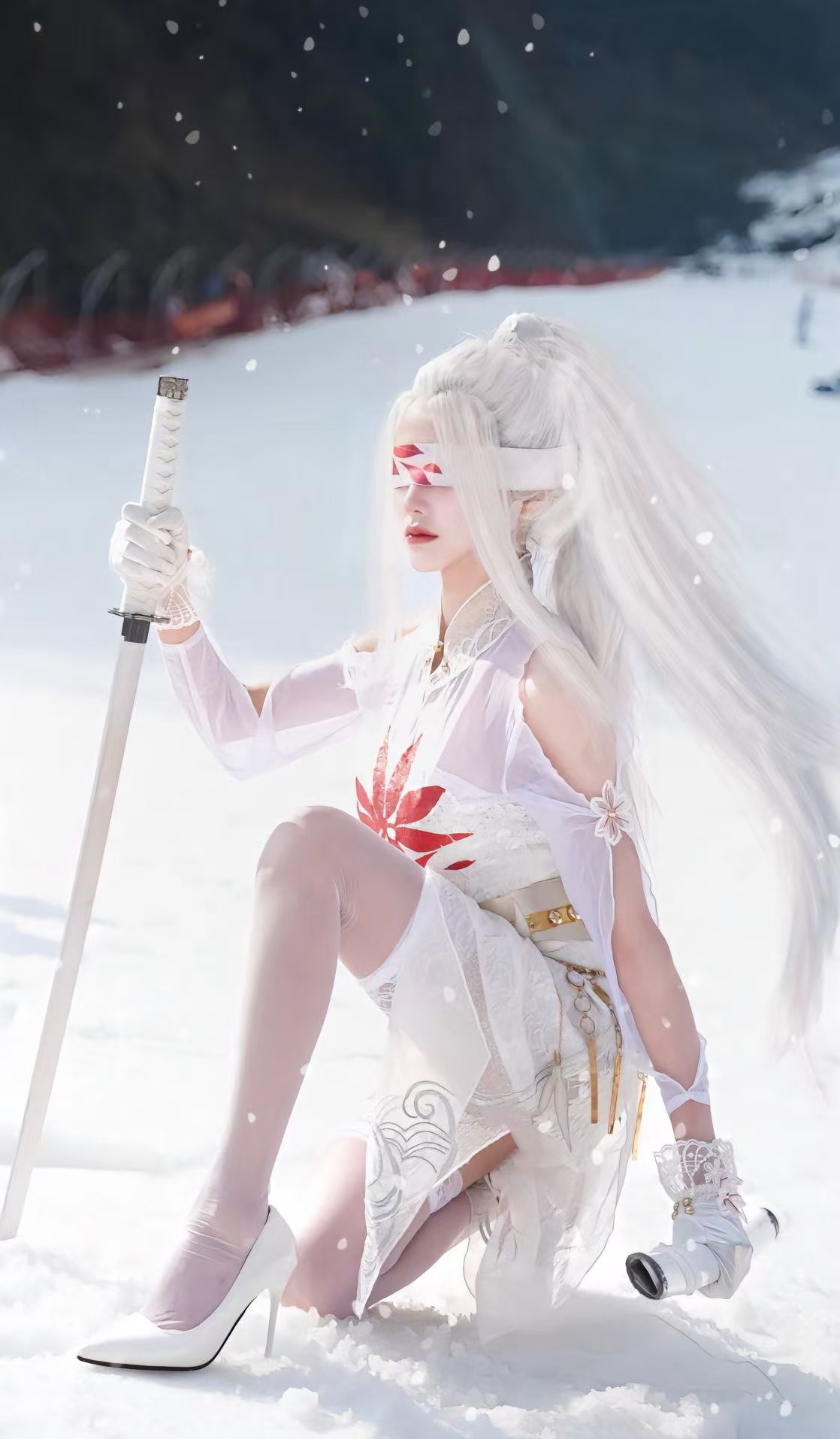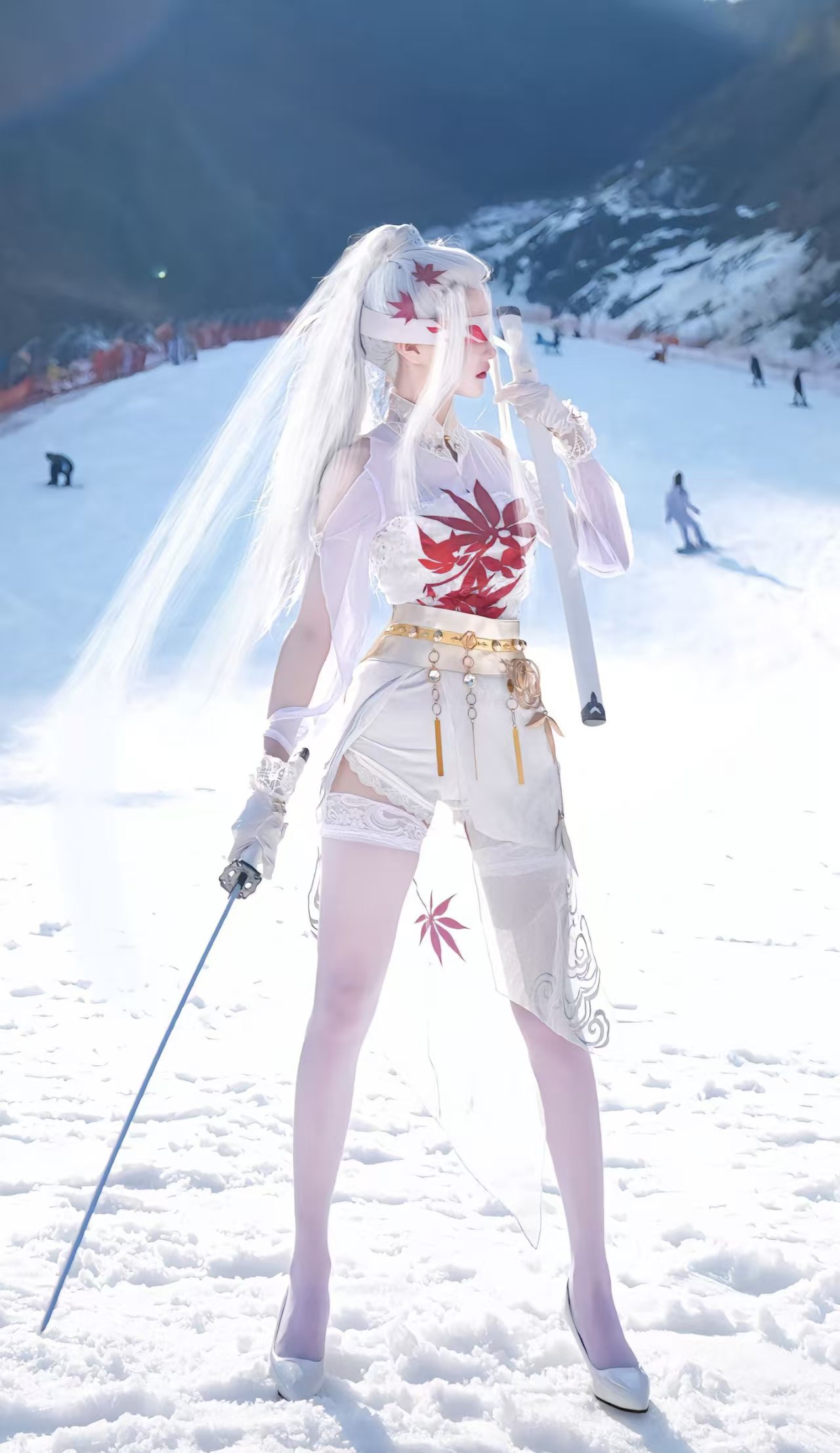 雪地,滑雪场里cos宁红叶的蒙眼高挑美女