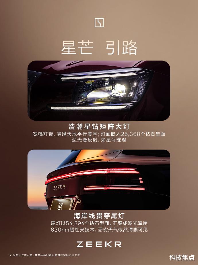 设计上,8X延续了极氪的家族面孔,比如直瀑式格栅和标志性的灯组,但整体风格更偏向运动。它的车顶线条是溜背的,车身姿态显得低趴宽体,被一些提前见过的媒体形容为带有一种“西装暴徒”的气质。不过审美见仁见智,也有部分观点觉得其车尾设计略显复杂。尺寸上,它比9X稍紧凑,主打大五座布局,后排空间和后备箱容积都很大,也提供了六座选项,但显然不是核心。